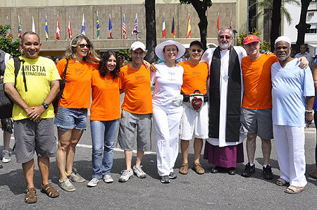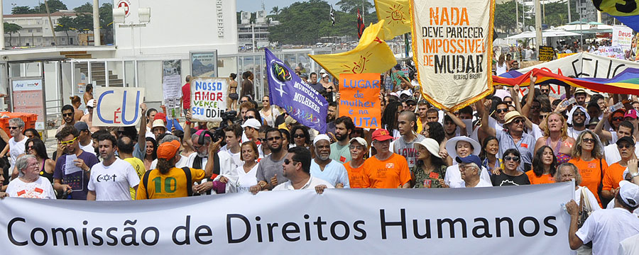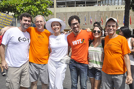 Em Copacabana, Rio de Janeiro, o Movimento participa de mais um manifesto em repúdio a permanência de Marcos Feliciano na Comissão de Direitos Humanos da Câmara. Do MHuD: Osmar Prado, Priscila Camargo, Gilberto Miranda, Ricardo Rezende e Salete Hallack.